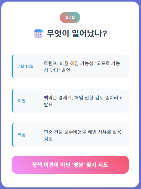 특히 주목할 점은 트럼프 행정부가 연준 건물 보수 공사 비용을 파월 의장 해임 사유로 활용할 수 있다고 시사한 것입니다. 이는 정책적 이견이 아닌 '명분'을 찾아 해임을 시도하려는 것으로 해석됩니다.