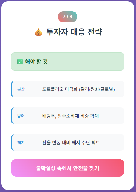 불확실성이 높은 시기에는 방어적 성격의 자산 비중을 늘리는 것이 바람직합니다. 배당수익률이 안정적인 우량주, 필수소비재 섹터, 그리고 실물자산에 대한 관심을 높여야 합니다.