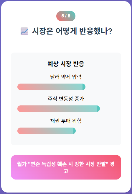 월가 주요 인사들은 연준 독립성이 흔들릴 경우 달러 약세와 주식·채권 투매 등 강한 시장 반발이 예상된다고 경고했습니다. 연준의 정치적 중립성에 대한 의구심이 제기되면, 미국 금융시장의 신뢰도가 근본적으로 흔들릴 수 있습니다.