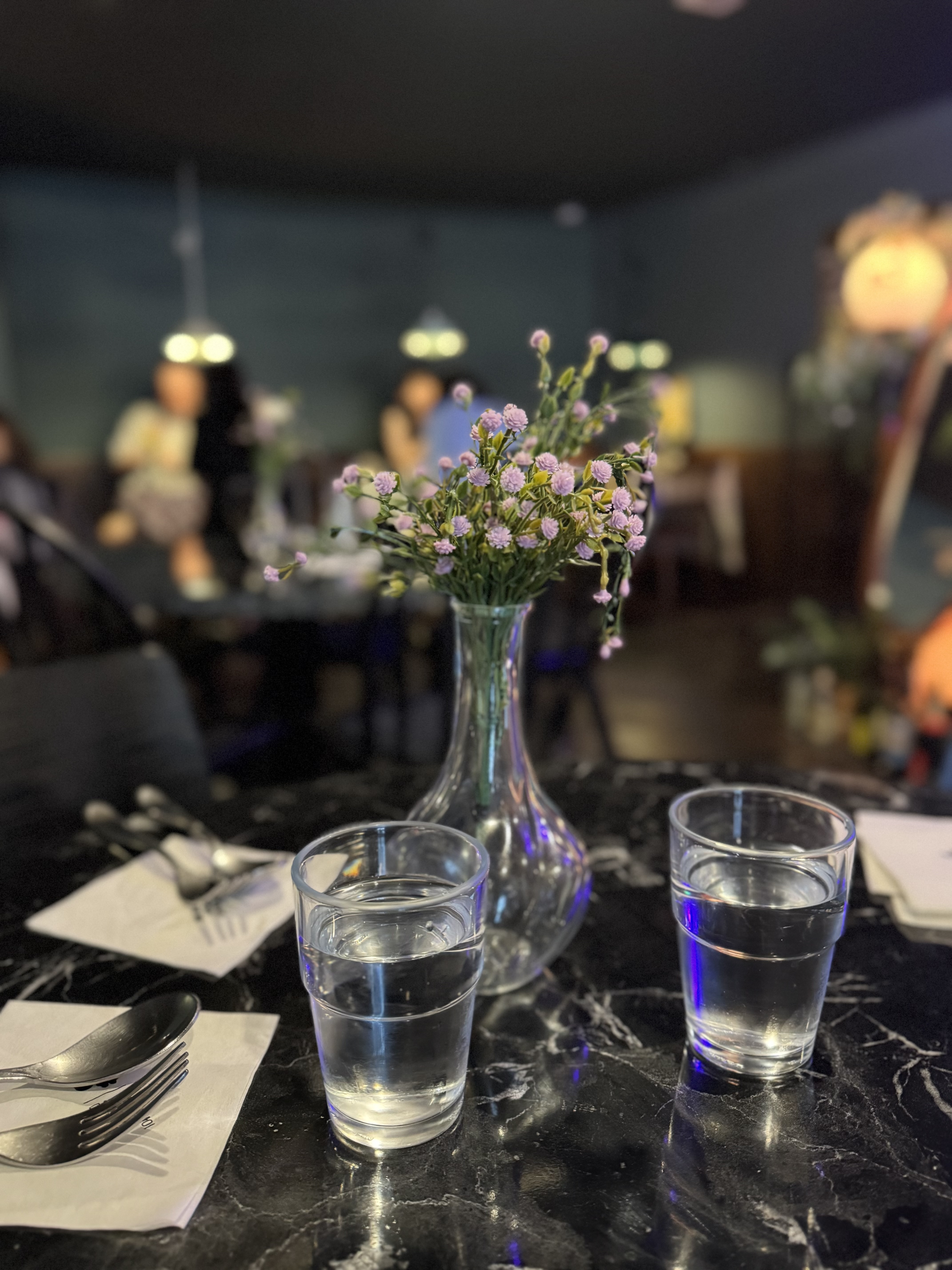 - 테이블마다 놓인 작은 꽃병과 캔들 - 로맨틱한 분위기 연출