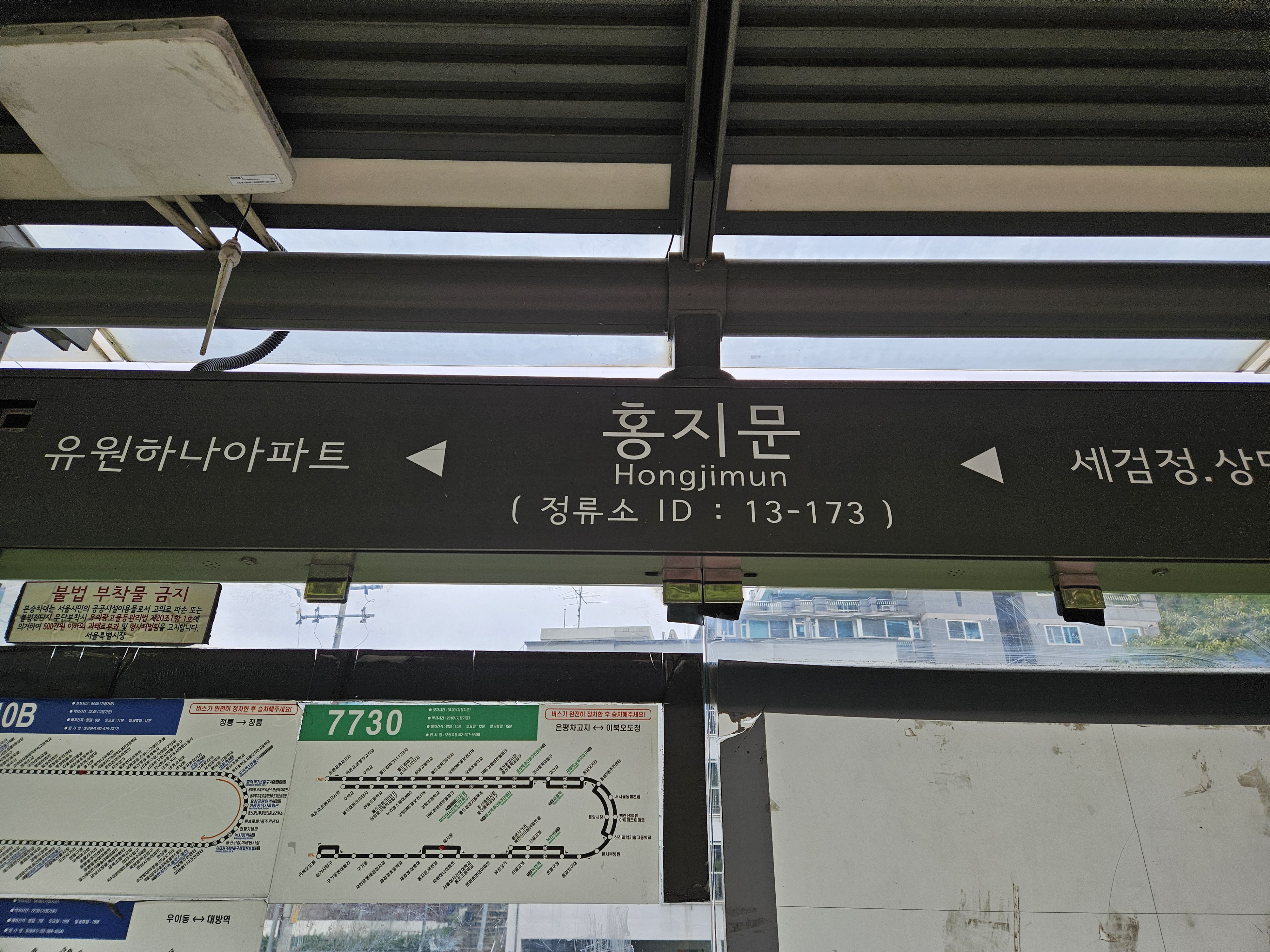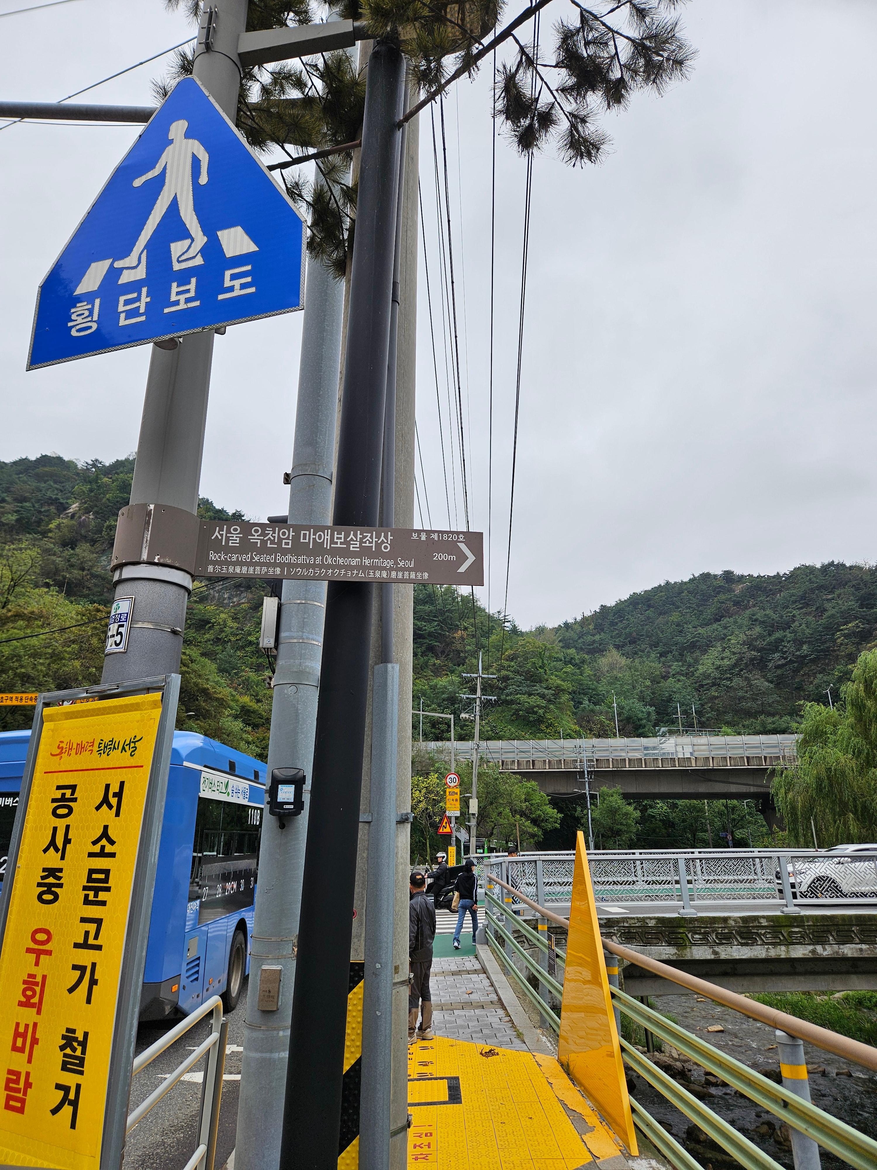 7정거장 후 홍제문역 정류장에 하차해 개울을 건너면 북한산 자락길 3코스 출발지에 도착합니다.