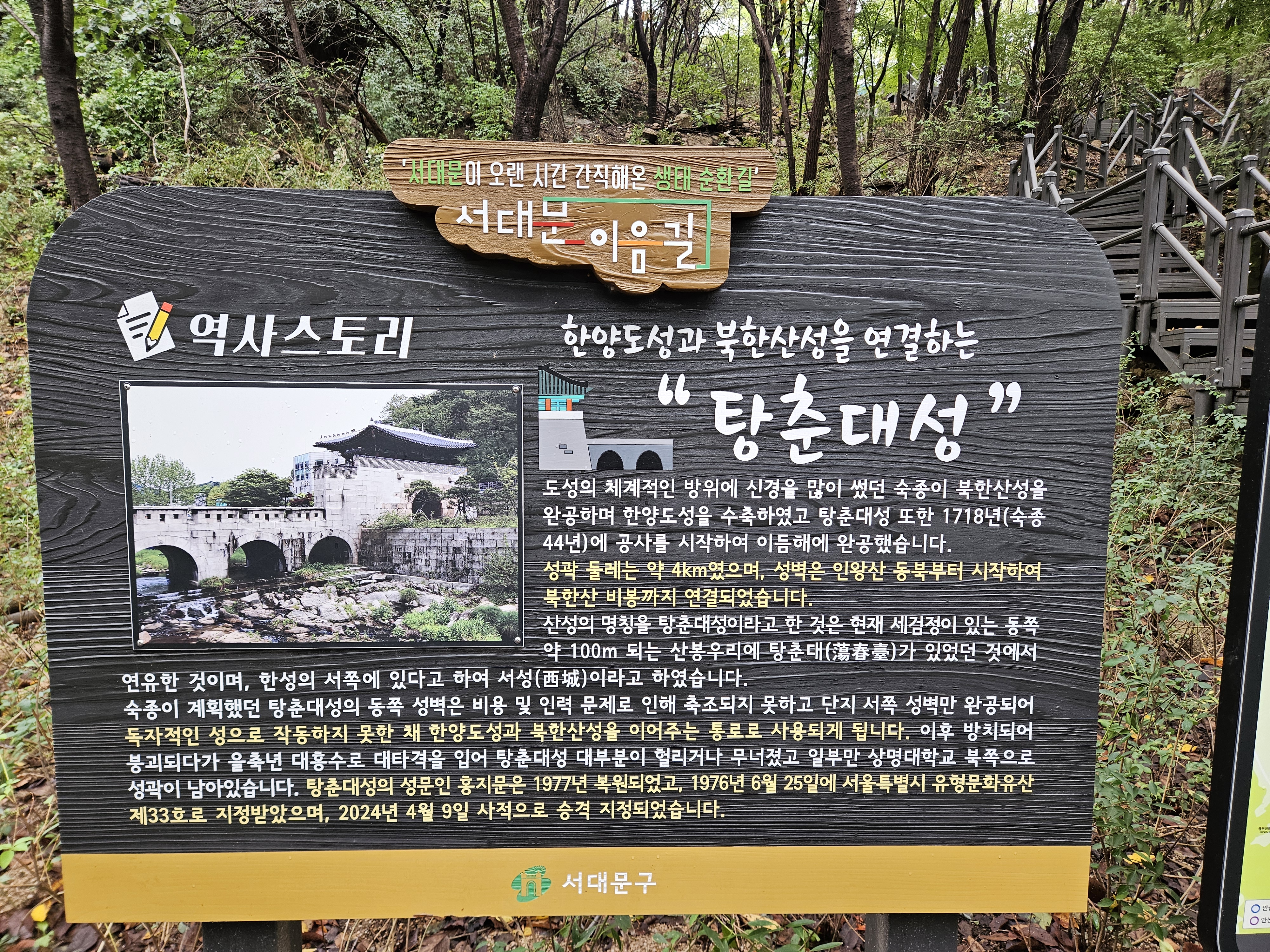 7정거장 후 홍제문역 정류장에 하차해 개울을 건너면 북한산 자락길 3코스 출발지에 도착합니다.