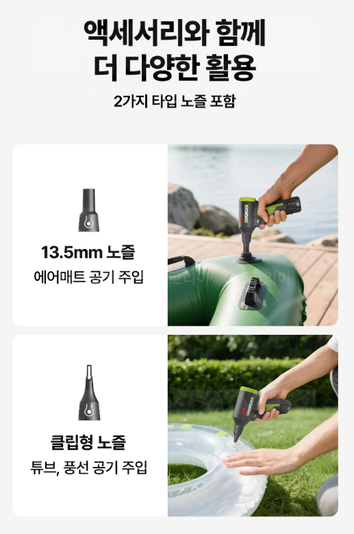 - 넓은 바람용 확장 노즐: 책상, 차량, 공구 청소 등 일반적인 사용