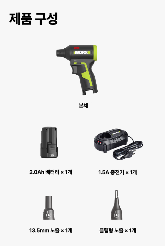 구성품 본체, 노즐 2종, 배터리(옵션), 충전기(옵션)